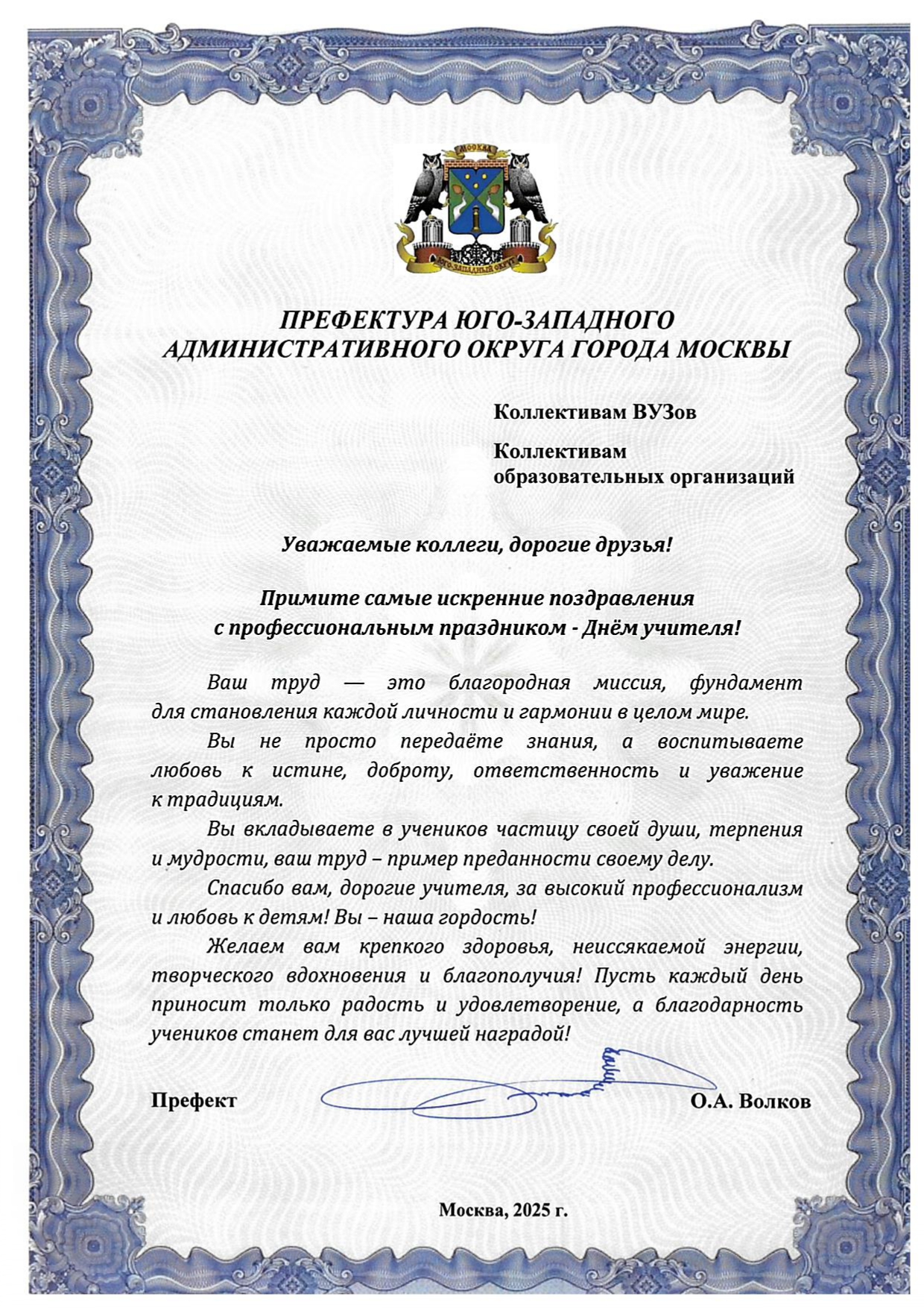 Поздравление с Днем учителя от Префектуры ЮЗАО