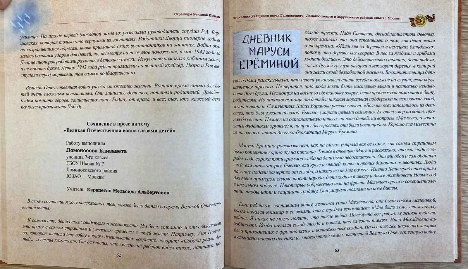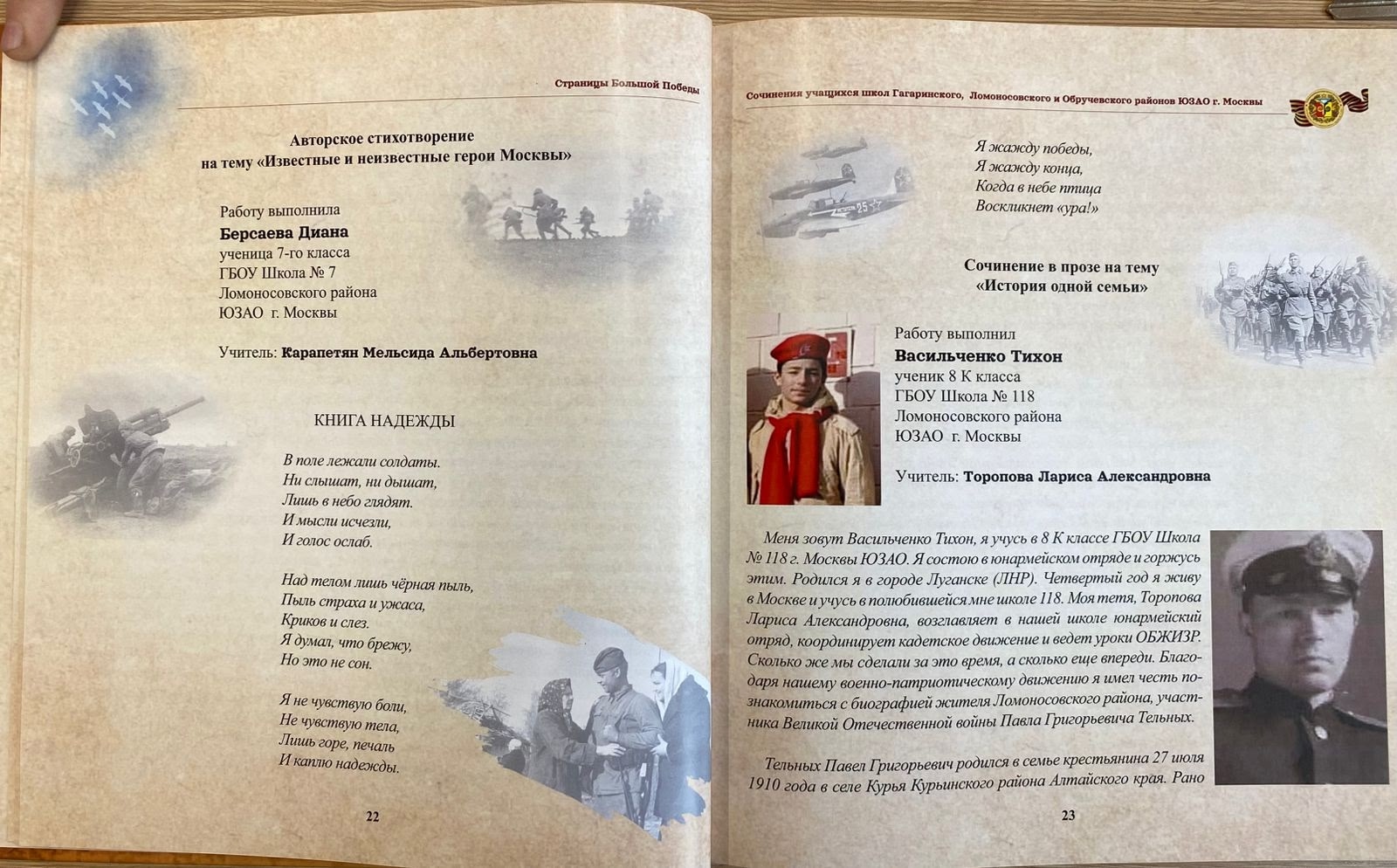 Состоялась торжественная презентация сборника школьных сочинений «Страницы Великой Победы», посвященная 80-летию Победы в Великой Отечественной войне 1941–1945 годов, организованная Окружным Советом ветеранов ЮЗАО, Советом ветеранов педагогического труда и управой Ломоносовского района.